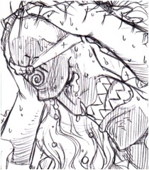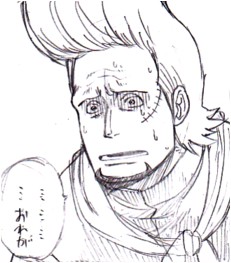 多くの場合、米神から始まって頬骨の辺りで終わるように描かれてるけど、私は生え際から始まって頬骨の辺りで終わるように描いてます。3コマという大変少ない情報からその姿を明確にするのは難しい。でもとりあえず、米神からの傷だと、思いっきりガープ中将と同じ傷跡になっちゃうんだもん! そんな運命を感じさせる仕様ってどうよ。ってなわけで、拙宅のサッチの傷は、初登場1コマ目のサッチ(笑)の仕様なのです。